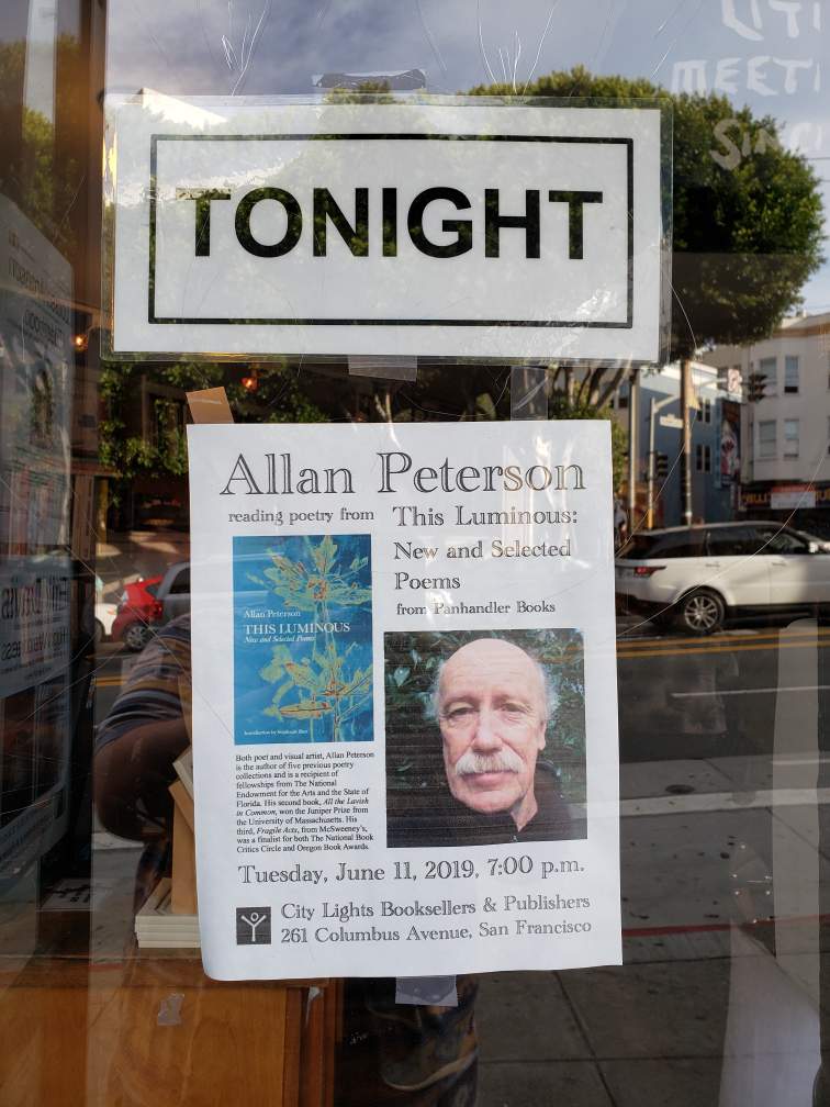Panhandler Books author Allan Peterson recently read to a packed house at the esteemed City Lights Bookstore in San Francisco. Check out the photos below.