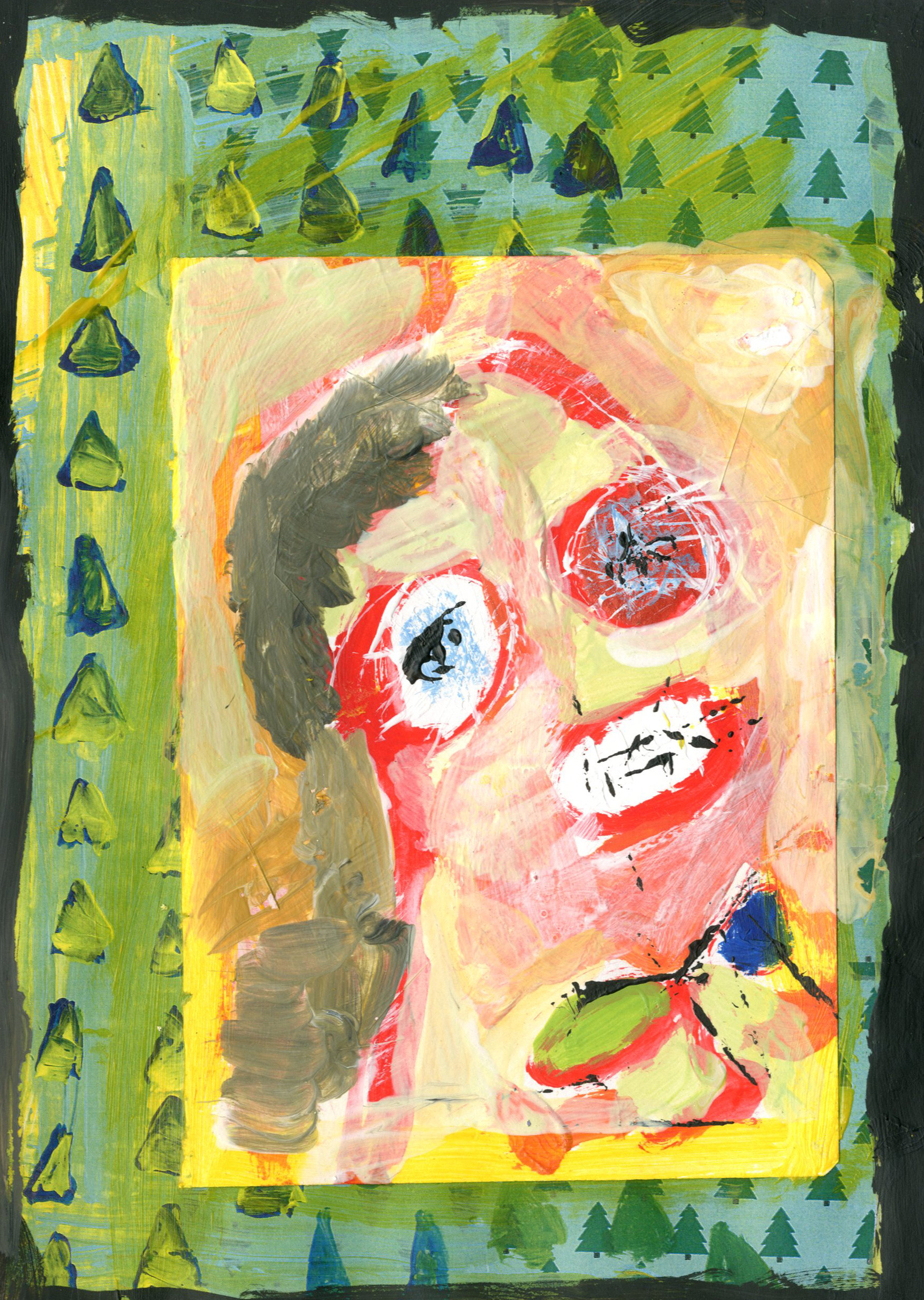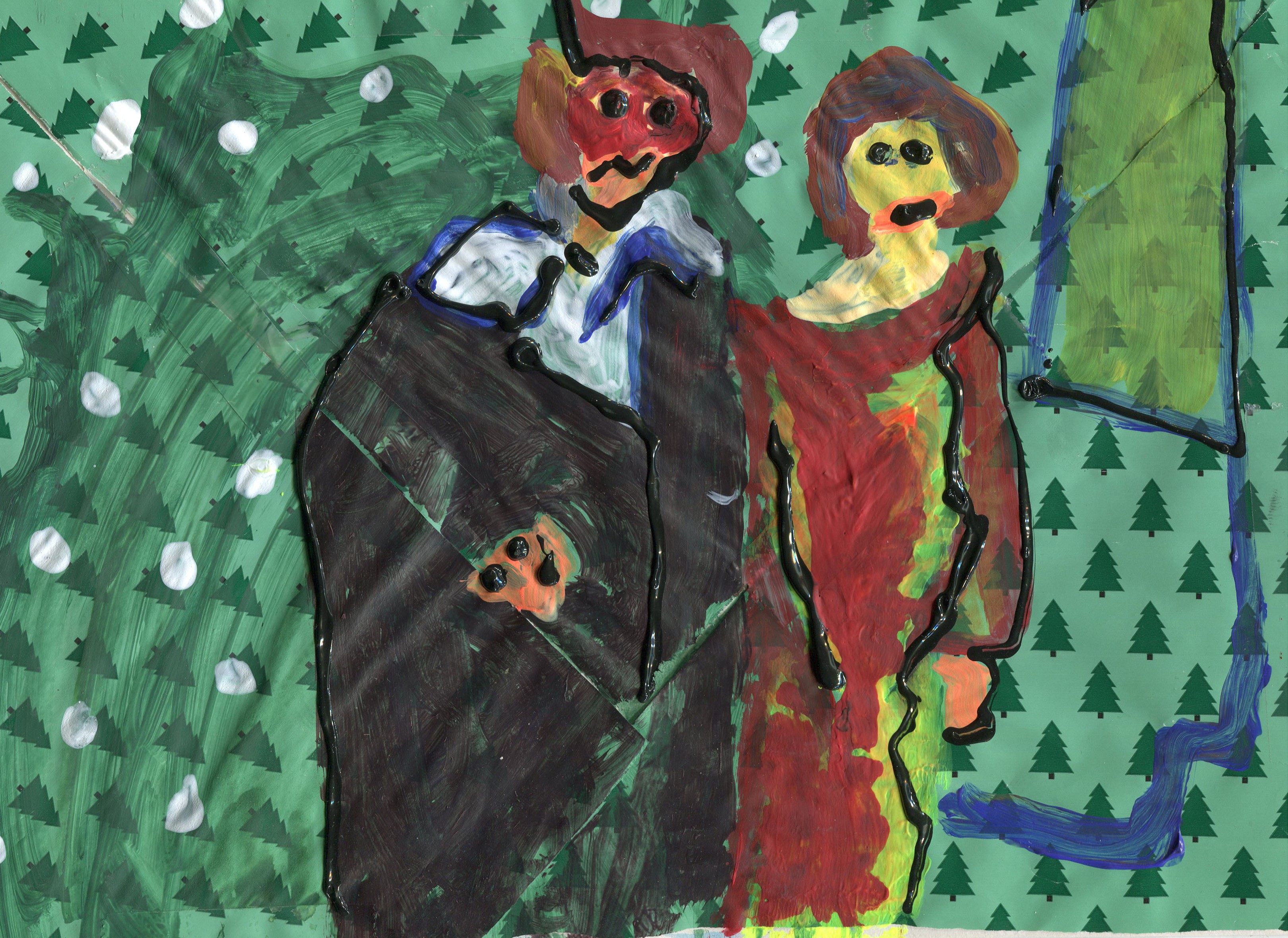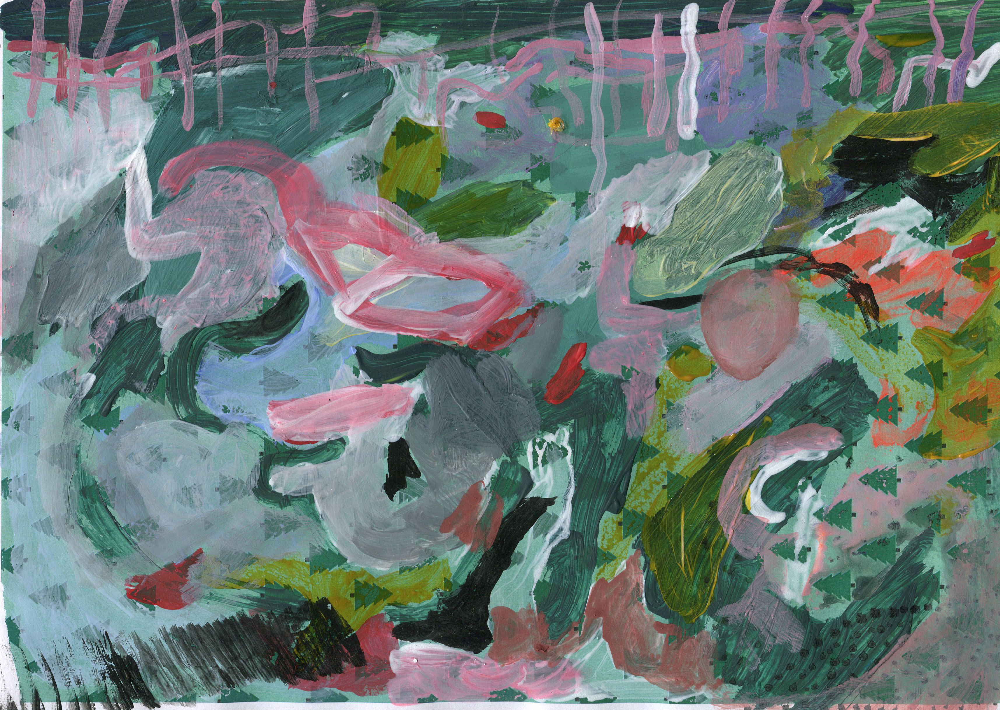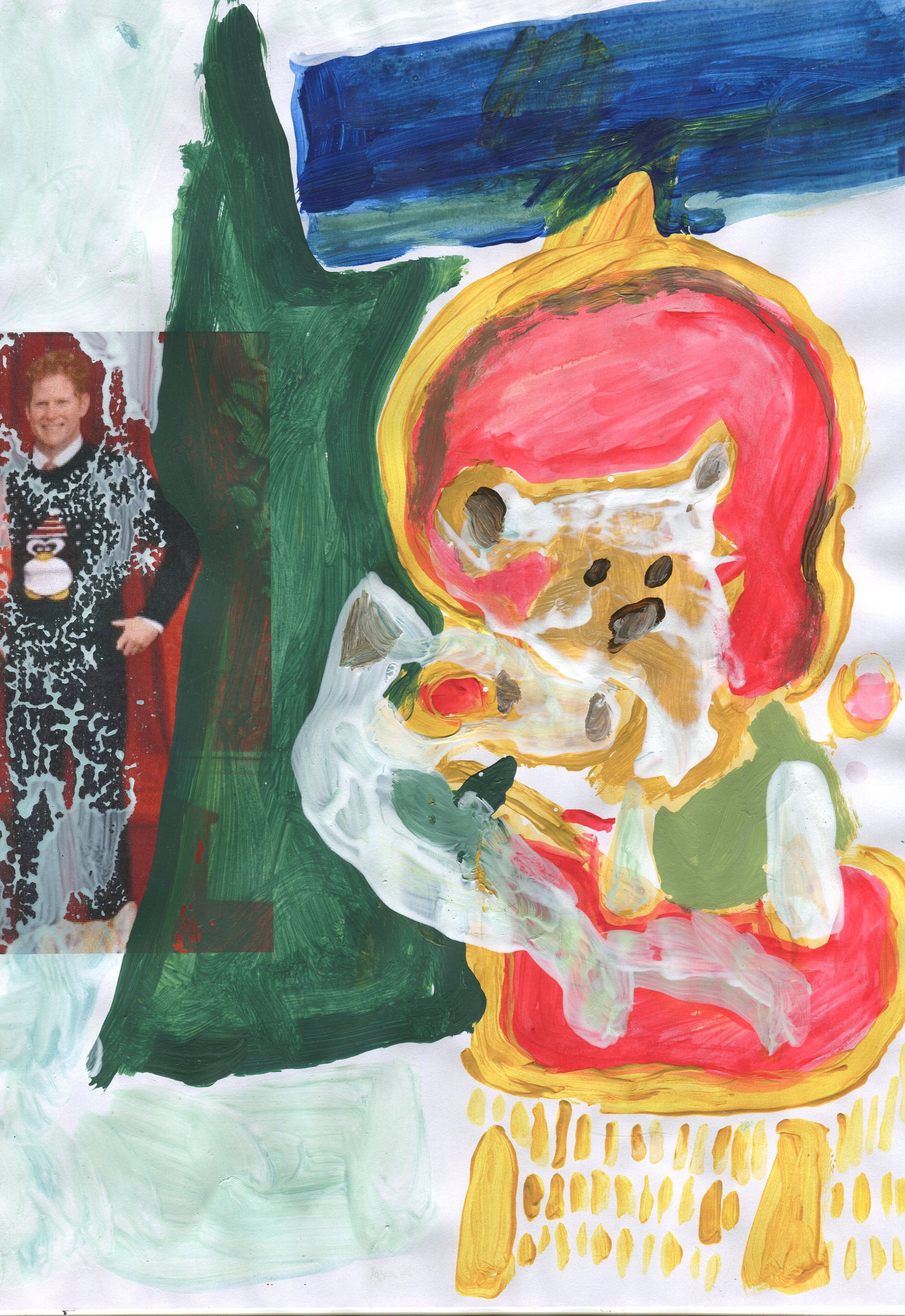 Recently I was thinking about Christmas themed episodes of TV shows that run in the summer. These shows were made for a specific context and were warped by repetition, being seen repeatedly in a different context. I realized that this was a bit of a twentieth-century idea, reruns perhaps not existing, any more than television does in 2020. At the same time, I was writing a travel grant to visit museums to look at specific work, and writing about paintings I had never seen in person. The two subjects had something in common, and I felt it made sense to place them in dialogue. I was creating small copies of paintings in my notebook, without having visited them in person or found a high-resolution version online. I made about a dozen small copies of Asger Jorns monumental painting “The Battle of Stalingrad” and a few other pieces by him, and some of his contemporaries. I collaged these images onto wrapping paper along with other images that were thematically linked. I thought the whole thing could be an investigation into methods of dispersion.