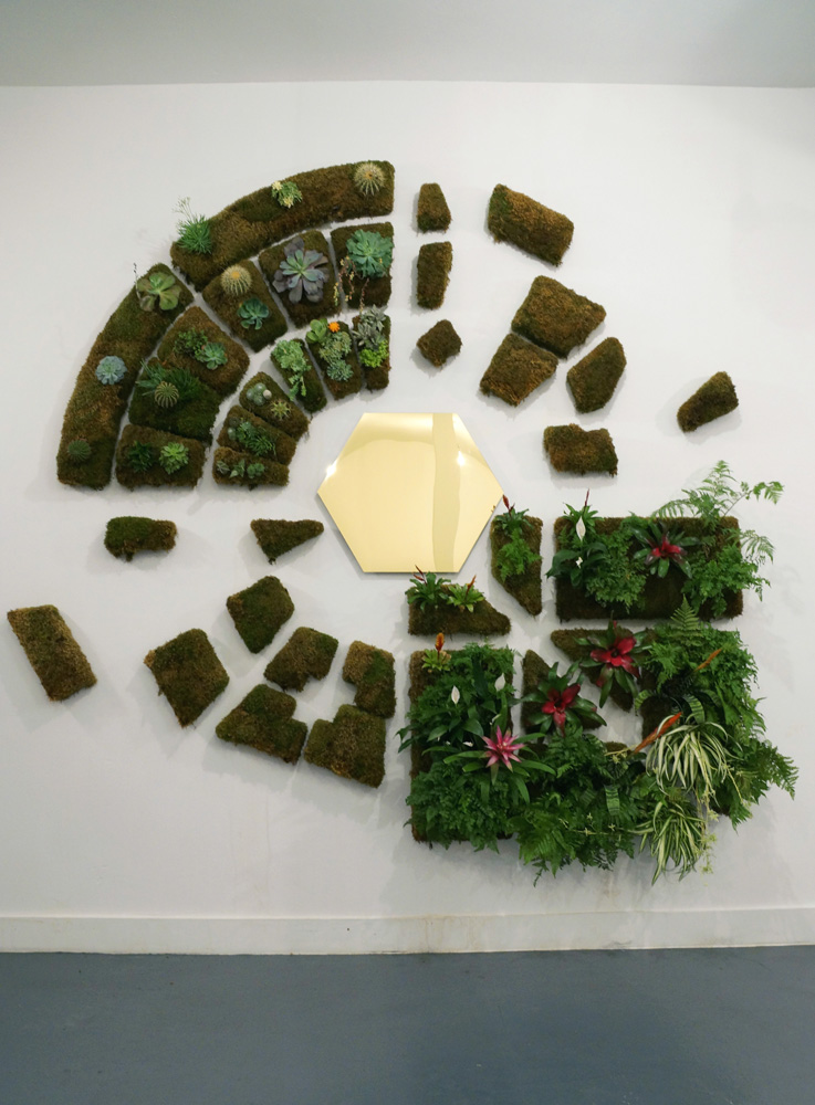 Gold mirrored plexiglass, live plants, moss