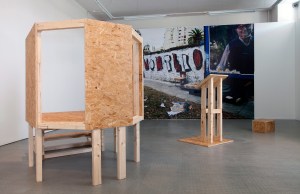 A rough construction of a pulpit, a lectern and a soap box