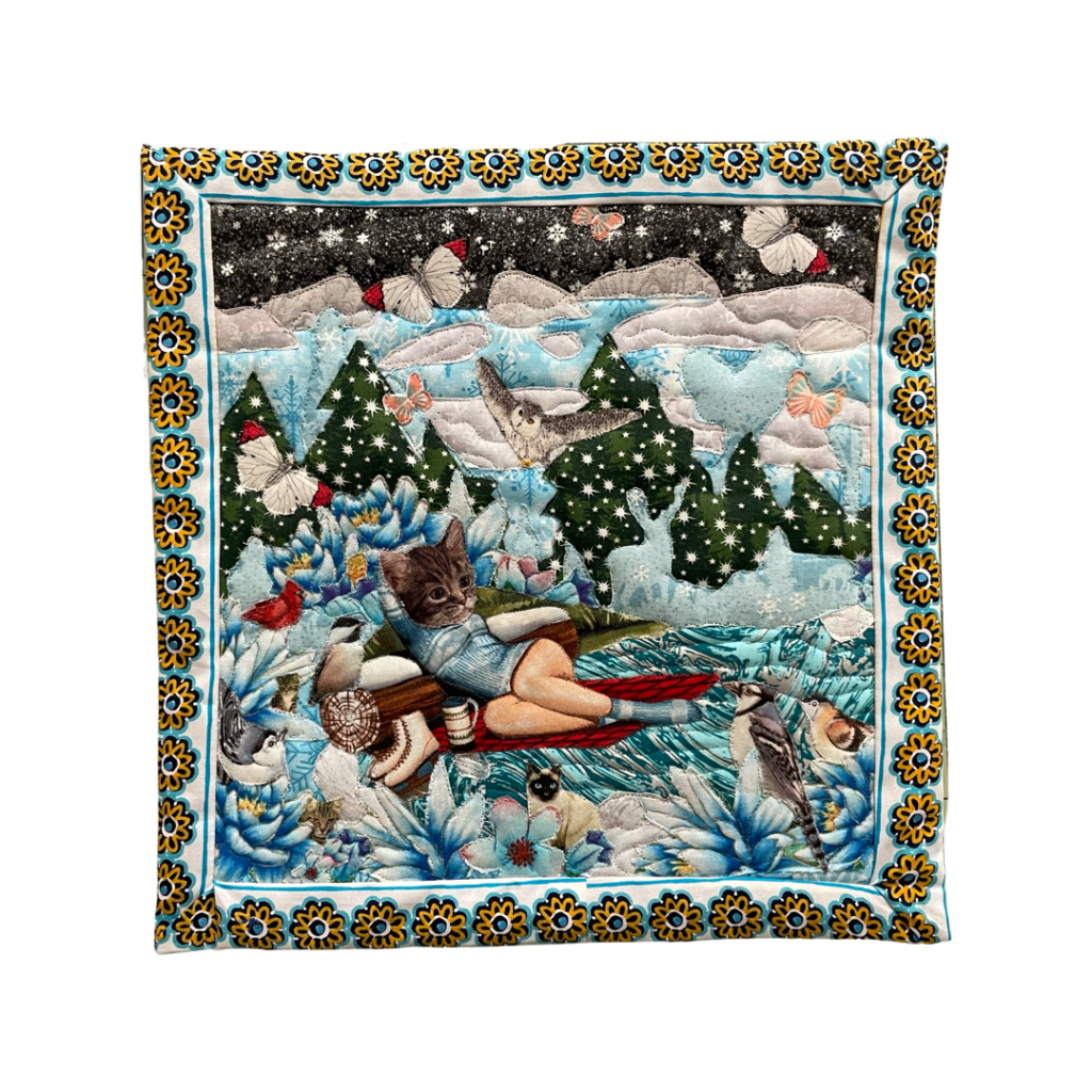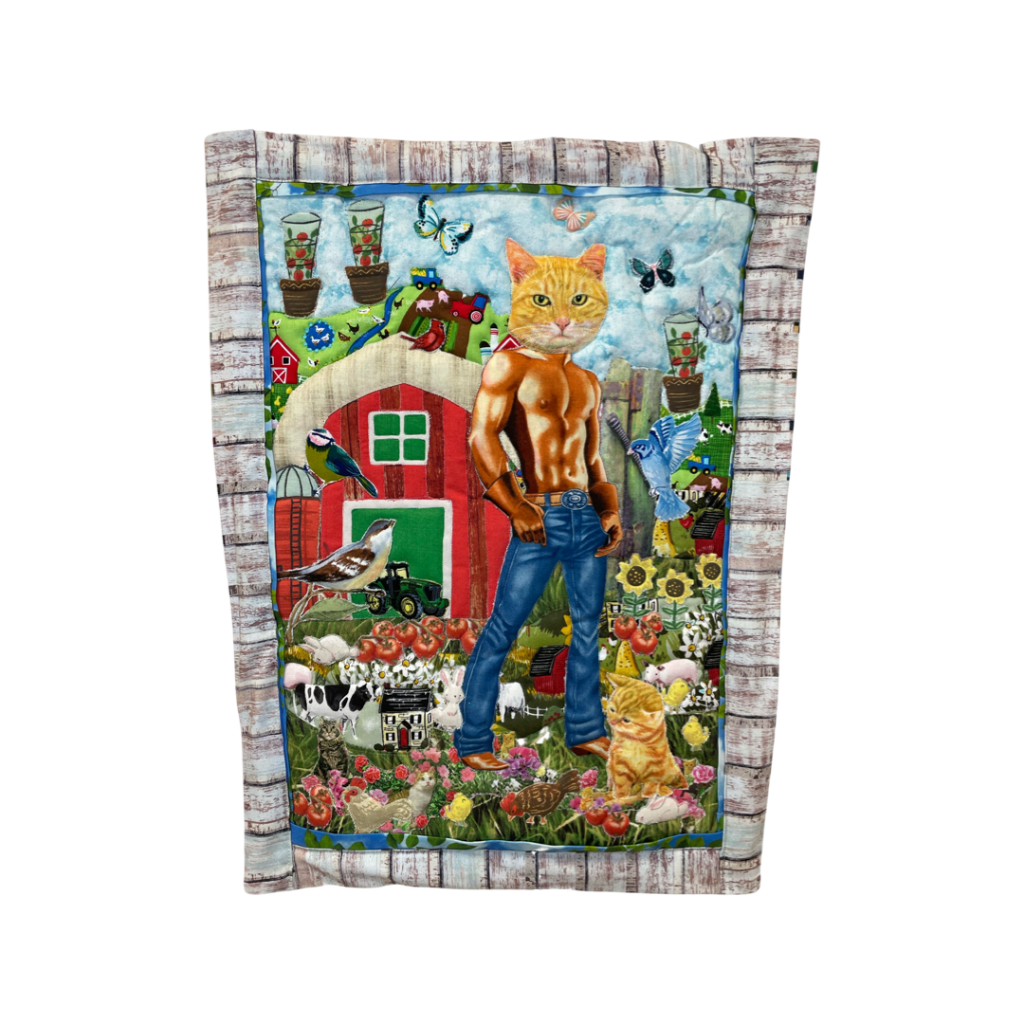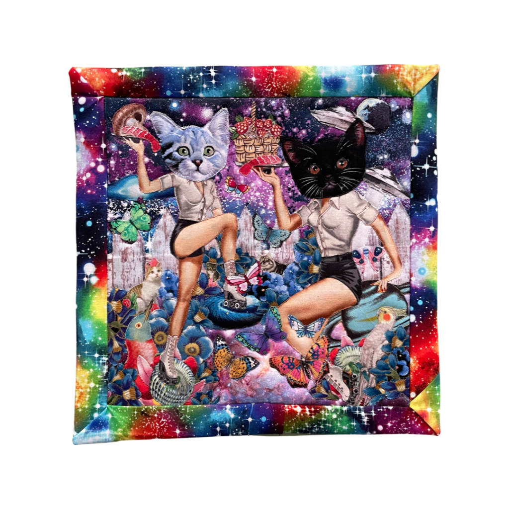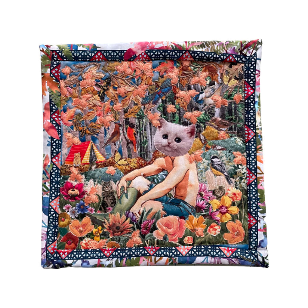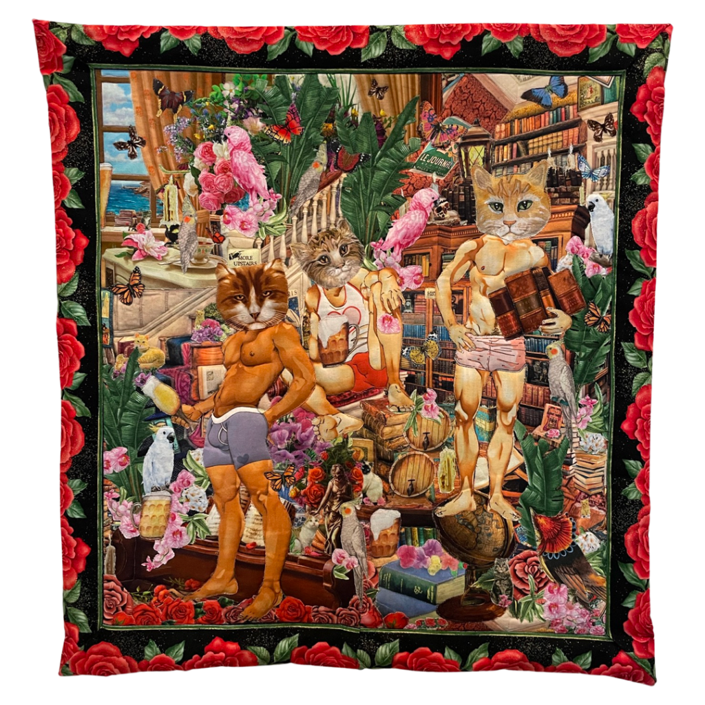 The utopic Adventure Cattery Quilt Show is a series of textile tapestries. Using applique, collage, and quilting techniques, this work centers around hope, companionship, the love of cats and nature. They are the ultimate, flowery, surreal fantasy escapist relationships with the people we want to be, the places we want to go, the days that aren’t too hot or too cold, where flowers are always in bloom, and there are no biting bugs.
