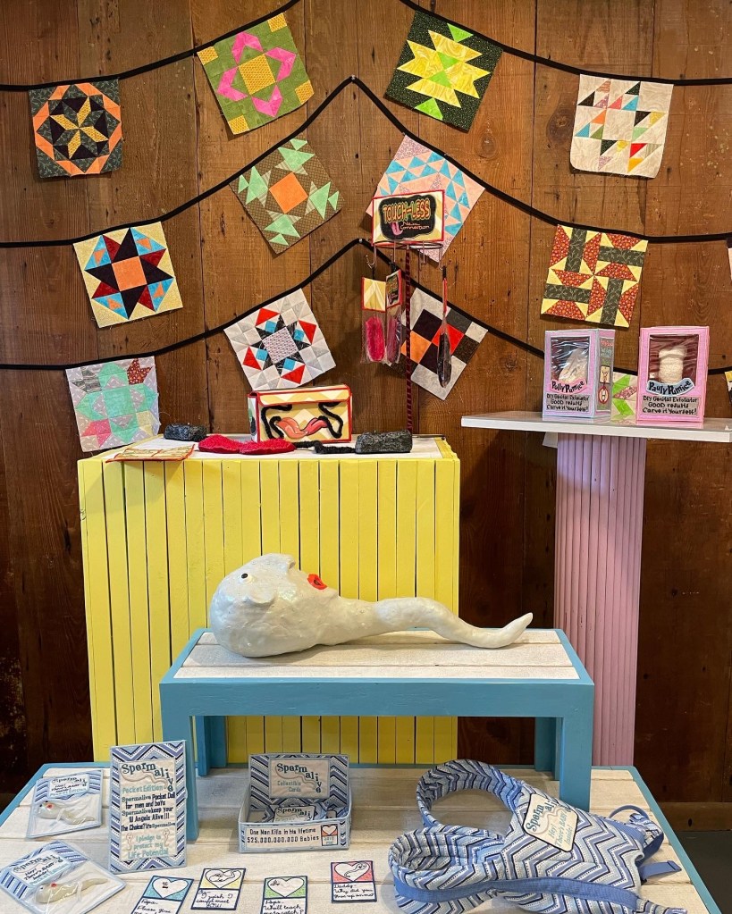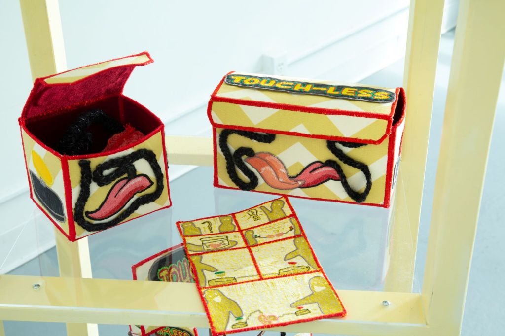 Boutique is a collection of soft inventions prioritizing research and process. Tardo’s interactive, sculptural pieces analyze how trends, modern marketing, social media, and algorithms manipulate a perspective to the benefit of controlling the masses. In intricate sewn and machine embroidered packages, control is reclaimed with hands-on, persuasive communication and fool-proof branding techniques. Mimicking the promotional language, graphic style and overt optimism of modern marketing, the objects tune into what we are conditioned to want: products to help with intimacy, beauty, and control.