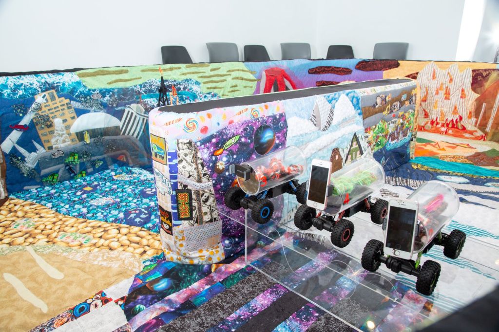 Snake Tube Adventure Racing is the world’s first quilted analog-virtual reality radio controlled-Tube Car racetrack. The quilted dioramic installation, check-in booth, self-guided tour pamphlet, and giftshop represent and depict the reality forecasted for life on our compromised planet. The work utilizes blended technology including robotics and digital projection, paired with sewn landscapes and soft sculpture. The game-like experience seeks to prompt deeper consideration of the condition of disconnection and manipulation experienced within a society overseen by persuasive marketing and green-washing by mega-corporations. Designed to be an interactive spectacle, the work is an absurd reflection on the frivolity of contemporary living, competitive distraction, and joyful disassociation during ecological collapse.