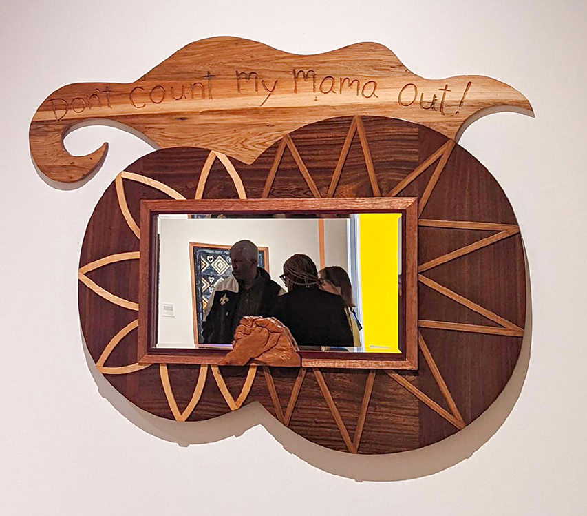Newcomb Museum invited Maxx to make a piece for Unthinkable Imagination: A Creative Response to the JuvenileJustice Crisis. Maxx was paired with a 12 year old girl who’s mother had previously been incarcerated. Maxx built a sculptural mirror frame inspired by the child’s words about her mother, carving them into the top of the piece. Conceptually, it is about the mother and child relationship. The center is a horizontal mirror, on two overlapping circles of mahogany. Two viewers, side by side, can simultaneously see their own reflections. Placed at the center bottom of the mirror are two embracing hands of a mother and child carved from cherry. The piece is divided into halves, the “child side” and the “mother side”. The “mother side” is a larger circular shape with flower petals of wise old-growth cypress. The “child side” is a smaller circular shape with petals of young new-growth cypress. The circle shapes are made of African mahogany and the top banner, with the child’s words, is of old-growth cypress. The pink and purple mirror frame banding is of sapele and purple heart.