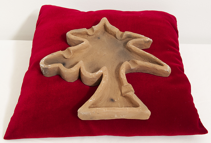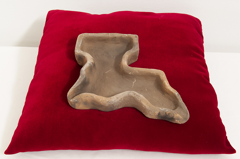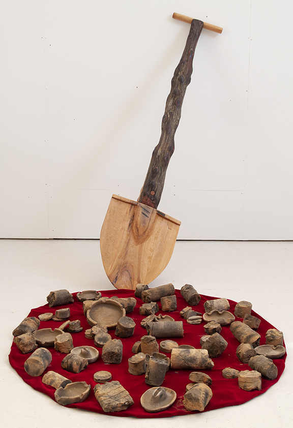 The Installation entitled, Sliver By The River (75 feet down), illuvial project: illuvial deposits are the foundation of existence in Southern Louisiana. Much of this fertile land, which gives us so much, is and has been polluted and destroyed by levies on the river, logging of cypress forests, extraction and refining of oil, dredging of canals, and chemical plants. The result is climate change and erosion that is displacing people. This work is constructed from illuvial clay borings collected from a site in New Orleans. The borings document ground content from surface to one hundred feet below. The clay is distinctly different at depth levels, reflecting the slow building of the landscape by the over-flowing Mississippi for thousands of years. Some of the borings have been preserved and some were rehydrated so they could be constructed into ashtrays. Both are fired in a method which gives them the quality of artifacts. The work includes a shovel carved from native Louisiana old growth cypress with a handle of American cedar drift-wood pulled from the river. Both cypress and cedar are types of wood valued for their water and rot resistance qualities. The cypress is an artifact of a landscape that no longer exists; and the clay is a reminder of continual land loss.