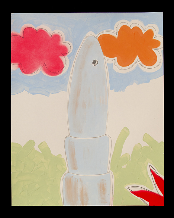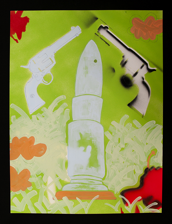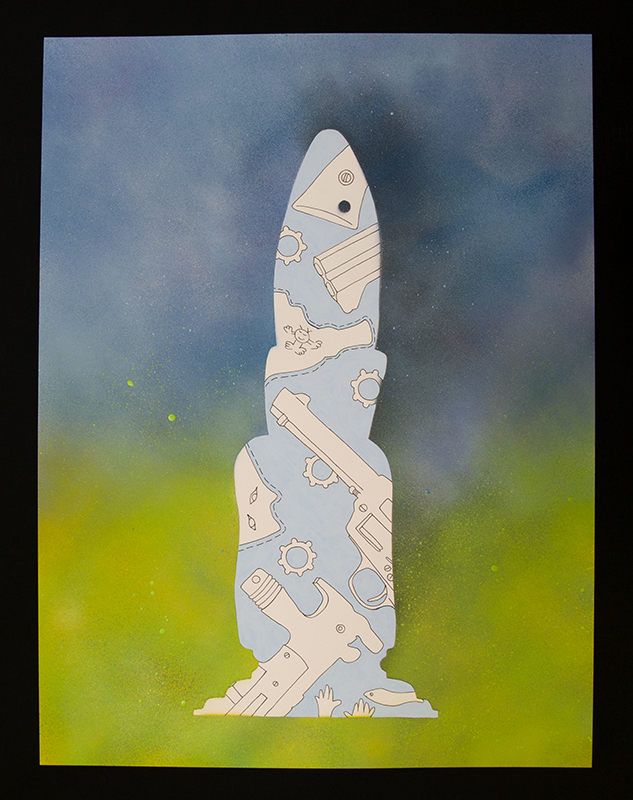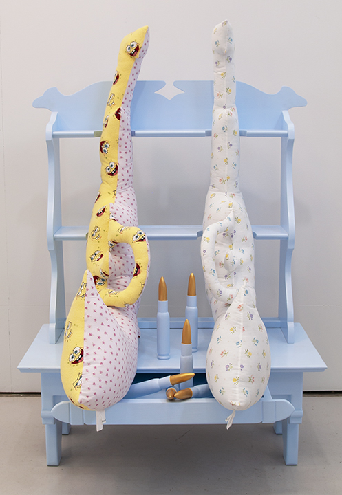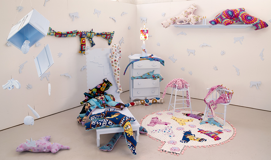 Maxx’s installation, Head Start (1949-2018 Mass-Shooting Project), was created over the course of three years. It sets the scene of a child’s bedroom filled with gun-shaped hug pillows made from recycled children’s bedding materials. The fabrics are brightly colored with patterns similar to what we ourselves may have had. Each pillow represents a different mass-shooting with a tag on each noting the location, year the shooting happened, the guns used, and number of people who lost their lives. The bedroom, in its sweet colors, is creepy and cemetery-like. The furniture is painted a flat dead light blue, headstone-like; The pillows strewn about the furniture are body-like and the bed is like a cold autopsy table. The mobile dangles implements of violence over the dreaming child who studies bomb making for fun. The bedroom is rendered in sweet child patterns and baby colors. The hand-drawn coloring book provides the information about 17 mass shootings.