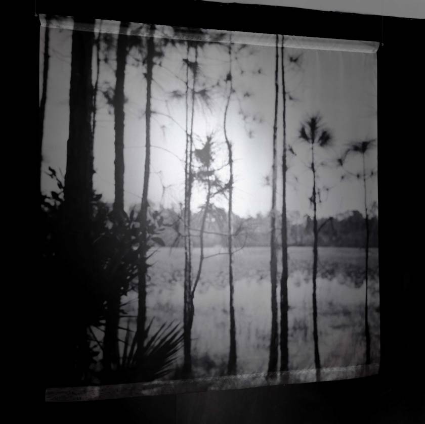 Pond near the mound complex. Photograph printed on voile, 60 x 60” fabric panel