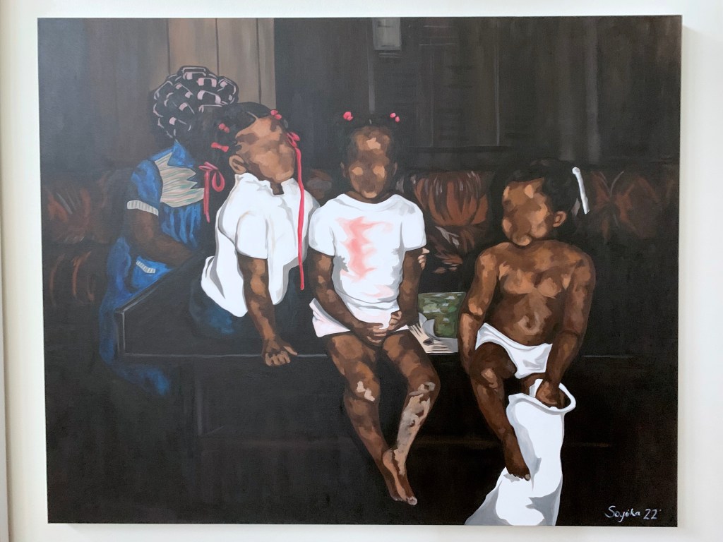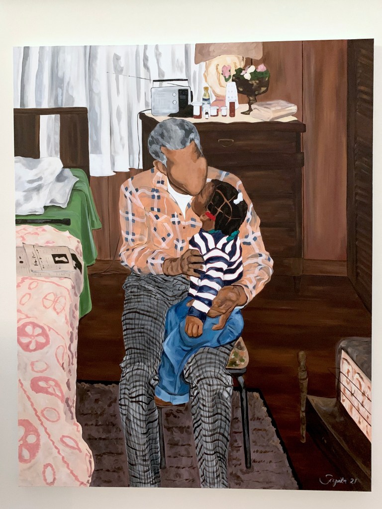 Soynika has spent the two years since our visit as the Artist in Residence on the 3rd floor of ACAC, but her practice still comes from the deeply lived, and very personal space of her home, her mother’s home, and grandparent’s home. The exhibition title is a quote from the youngest of Soynika’s four children, exclaimed as they watched her work from an air mattress on the floor of the studio – a new space more akin to the swanky art-caves of TV land. Emboldened by the space, canvases have gotten much larger, her painting now full human scale. The extra space has afforded Soynika a relationship with the details – the deep green of collards in the sink, the yellow brick patio bathed in sunlight, the patterns of things.