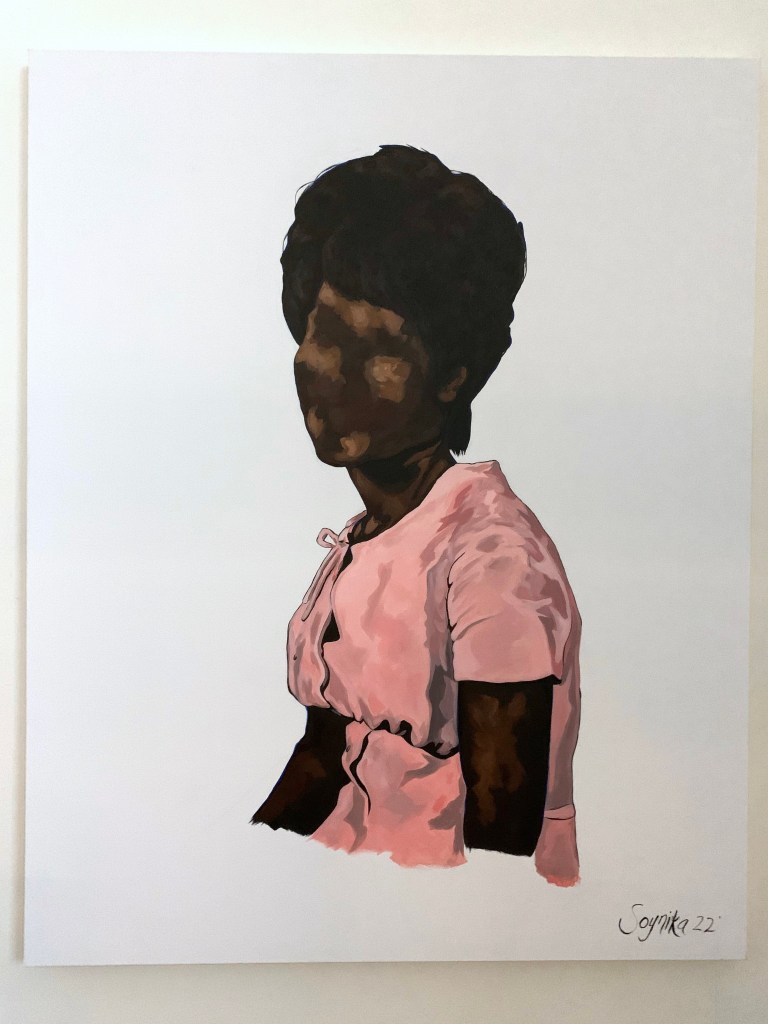 The intimacy of this work stems from the family photographs Soynika uses as source material. But she does not ask for witness. She draws you into this space, into her experience. Paintings she starts from memories are murky, the identities of kin muffled, beginning a broader conversation about Black identity, Black memory, and Black Love. With every detail intact, save the ones we correlate to a name: the eyes, the exact bend and shape of a nose, the crook of a smile or frown, Soynika’s work both haunts, and asks to be inhabited. Dynamic and steadfast figures stand tall in the center of her compositions, faceless but specific, defining the clothes, rooms and landscapes of a Black suburbia in the deep, deep South. Happy childhood memories underpin an ache felt at the loss of a face. These images are impossibly anonymous, both precise, and withheld. The omission of the details of each person’s visage makes way for revelatory and sometimes uncomfortable questions that shape Black identity and move from minutia towards a mandate to look past a name and into an experience of the world. “Mama, These Look Like Lost Souls” is a treatise on Black knowing and knowness. It invites you to explore what is remembered, what is lost, and what is truly knowable from the artist’s vantage point, and by that an act of radical empathy.